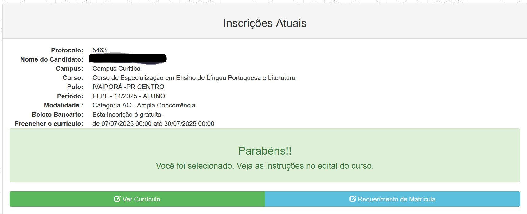 Se você teve o seu REQUERIMENTO DE MATRÍCULA D E F E R I D O significa que sua documentação foi encaminhada para o setor de Registro Escolar para os procedimentos de matrícula. Receberá o seguinte email: