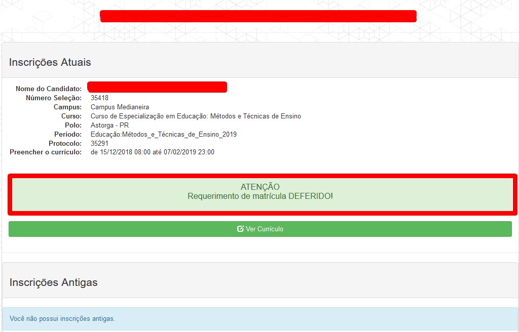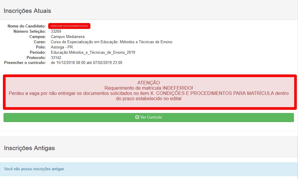 Se você teve o seu REQUERIMENTO DE MATRÍCULA I N D E F E R I D O significa que sua documentação não estava de acordo com o edital ou não foi entregue: